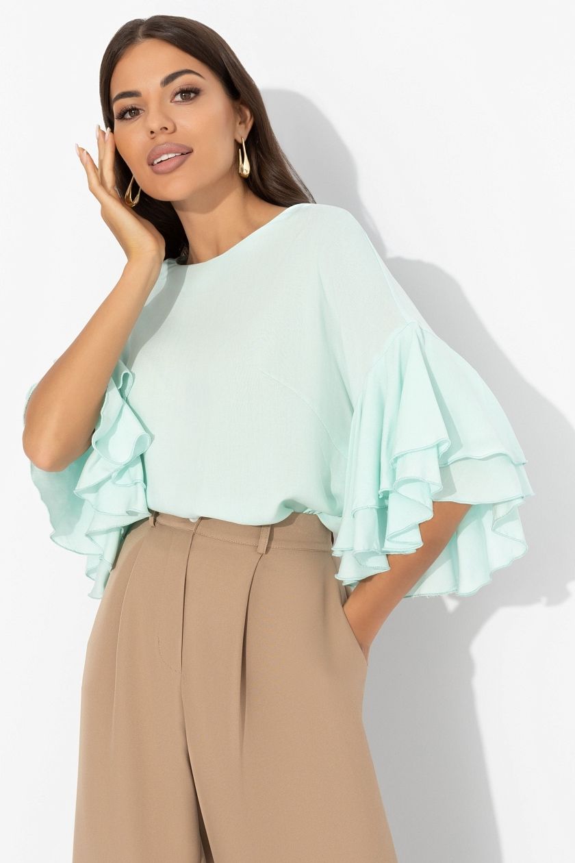 Блузка мятная из вискозы с воланами от бренда Charutti. Модель прямого кроя, выполнена из штапелного полотна. Спущенная линия плеча. Объемные рукава декорированы двумя слоями рюш. Блуза хорошо смотрится в заправленном виде и навыпуск. Стильный вариант для создания модного образа.