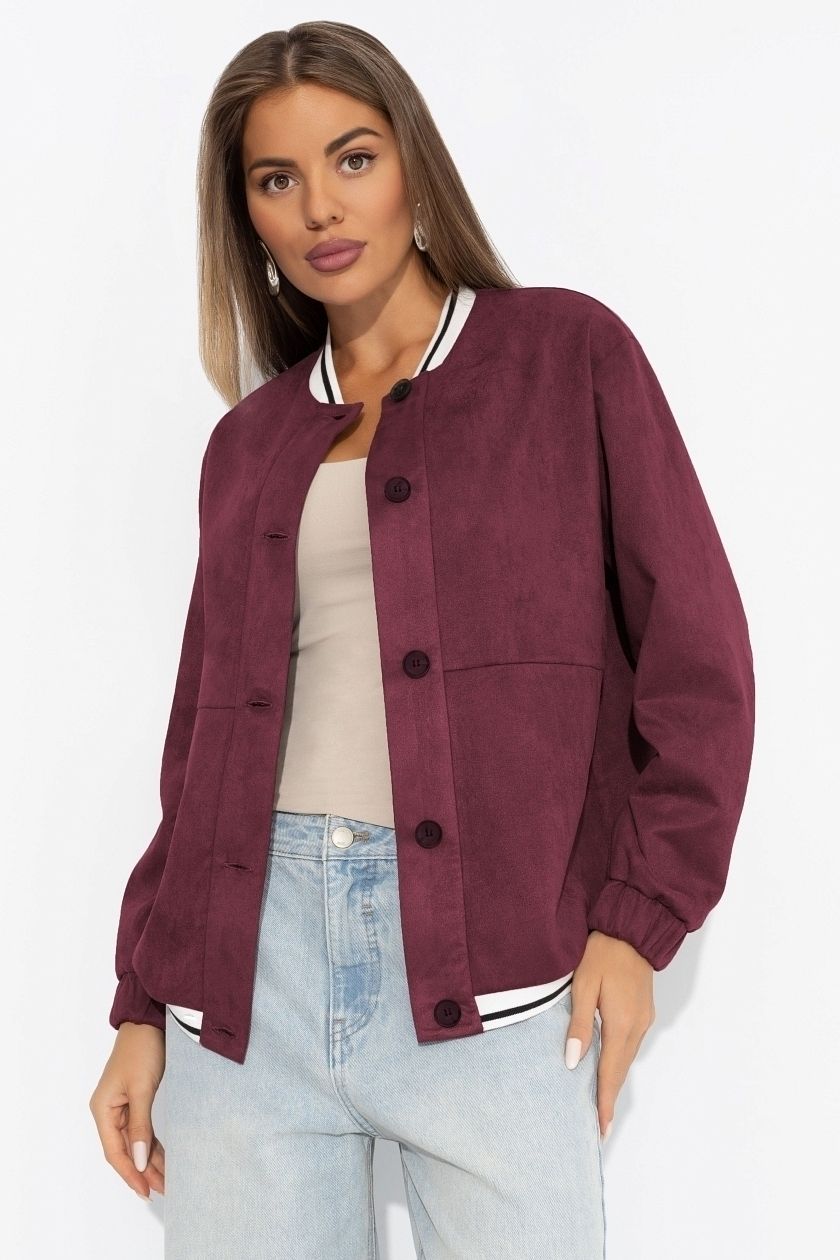 Бомбер бордовый из экозамши от производителя Charutti. Модель свободного кроя. Ворот и подол изделия оформлены трикотажной резинкой контрастного цвета. Изделия застегивается на пуговицы. Рукава оформлен скрытыми широкими резинками. Изделие с карманами. Без подклада. Идеальный выбор для создания стильного образа.