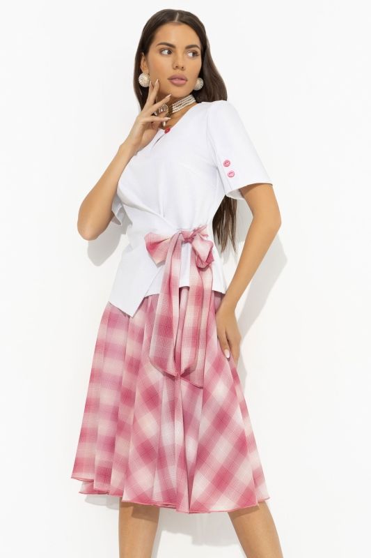 Костюм-двойка с юбкой комбинированный от компании Charutti. Эффектный жакет выполнен из трикотажного полотна белого цвета с фигурной горловиной и декоративной пуговицей, втачными укороченными рукавами. По переду идет эффект запаха на линии талии с завязками на бант. Юбка расклешённого силуэта с резинкой по линии талии. Отличный выбор для создания стильного образа.