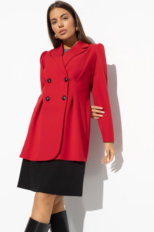 Костюм с удлинённым красным жакетом и юбкой от компании Charutti. Жакет полуприлегающего силуэта, выполнена из костюмной ткани "барби", V-образный вырез горловины с английским воротником, втачные длинные рукава, по бокам карманы, двубортная застёжка на пуговицы. Юбка расклёшенного силуэта, пояс на резинке. Идеальный выбор для создания женственного образа.