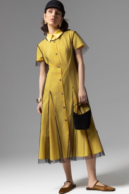 Платье-рубашка жёлтое с накидкой из сетки