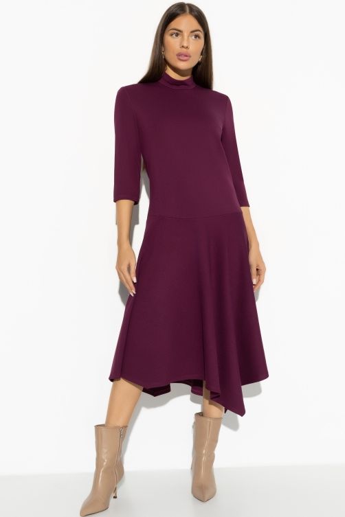 Платье трикотажное бордовое с асимметричным низом от компании Charutti. Модель полуприлегающего силуэта, воротник-стойка. Втачные укороченные рукава. Линия талии спущена, отрезная. Идеальный выбор для городских модниц.