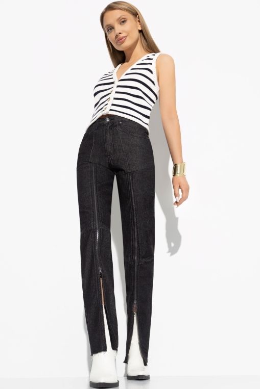 Серые джинсы с молниями по переду от бренда Charutti, выполнены из джинсы. Классическая застёжка гульфик и пуговицы. По бокам функциональные карманы. Шлёвки под ремень. Идеальный выбор для городских модниц.