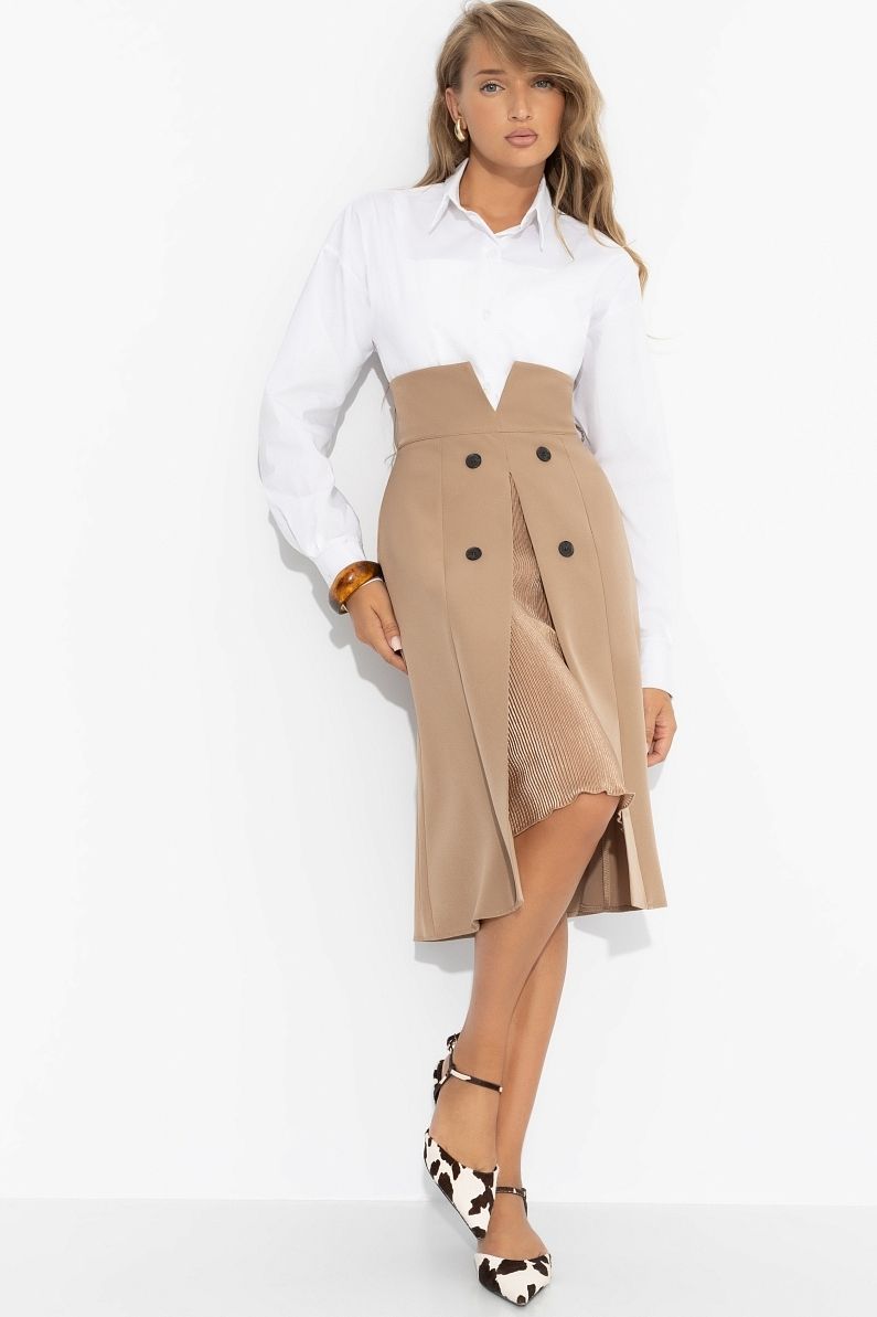 Юбка бежевая с имитацией многослойности от компании Charutti. Модель расклешённого силуэта, выполнена из комбинации двух видов ткани: «Барби», трикотаж «гофре». Посадка высокая на талии. Скрытая молния по спинке изделия. Есть пояс в тон изделия. Идеальный выбор на каждый день.