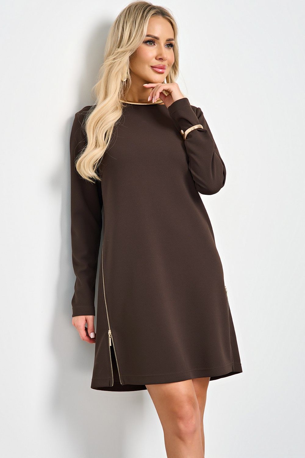 Платье шоколадного цвета с молниями в боковых швах от бренда Jetty. Модель А-силуэта, выполнена из крепа. Вырез горловины - лодочка. Длинный втачной рукав. Спинка со средним швом. Удачный выбор для повседневного гардероба.