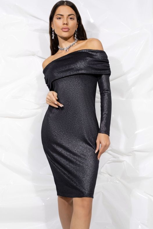 Платье чёрное трикотажное с открытыми плечами от компании Charutti. Модель полуприлегающего силуэта, выполнена из полотна с металлизированным напылением. Зона плеч со сборками по бокам. Деликатный разрез по шву на спинке изделия. Платье без застежки. Это Ваш отличный образ, в котором вы всегда чувствуете себя уверенно.