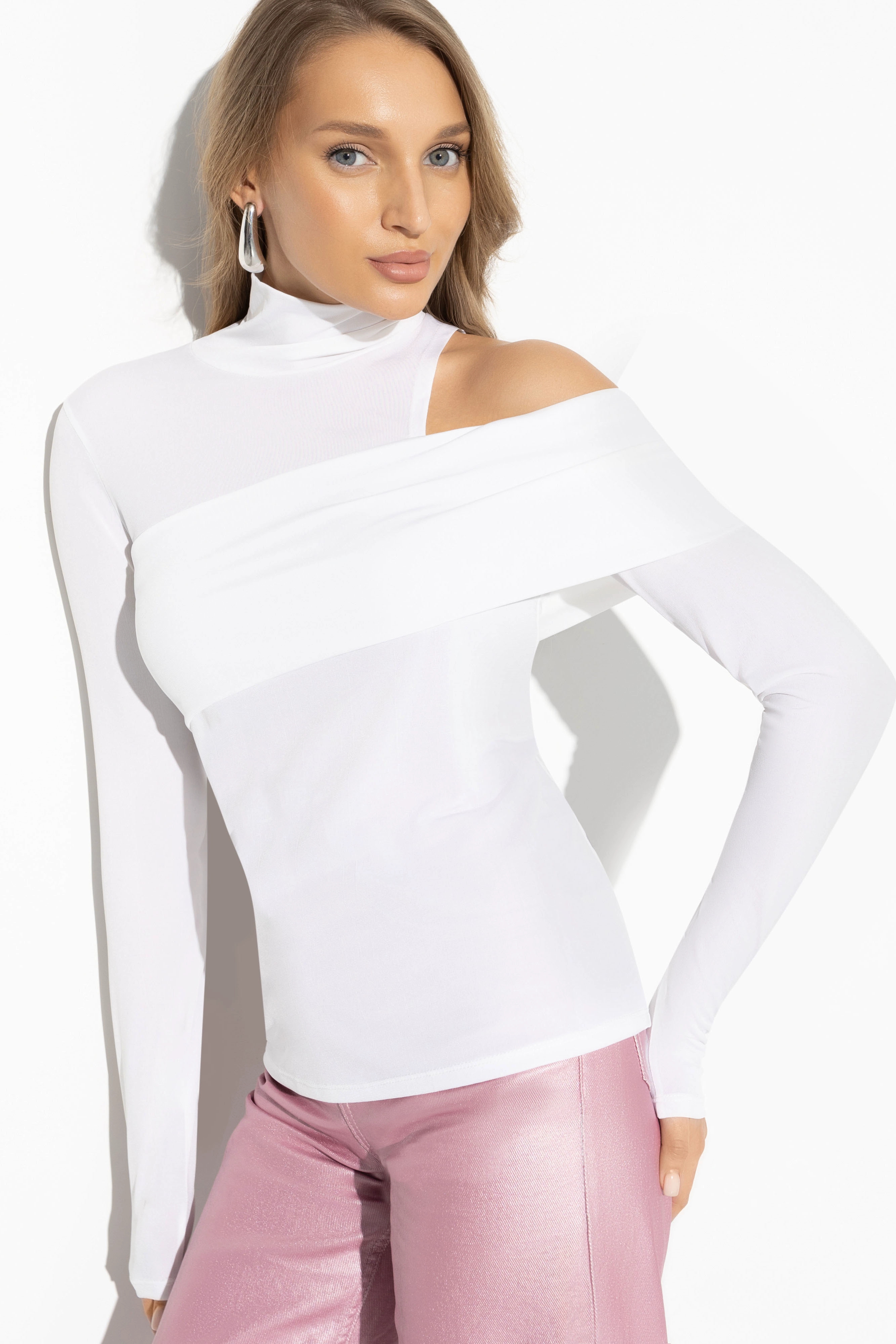 Белая водолазка с открытым плечом