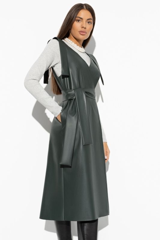 Сарафан зелёный из эко-кожи с карманами 44 размера