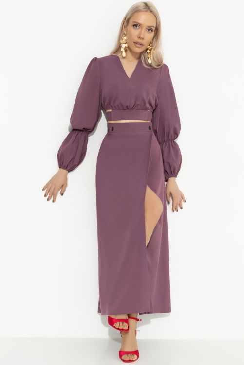 Костюм бордовый с юбкой дизайнерский от компании Charutti, выполнен из плательного полотна "ниагара". Комплект состоит из укороченной блузы и юбки в длине миди. Юбка струящаяся, на запах. Есть глубокий разрез. Посадка чуть ниже талии. Пояс на пуговице, по спинке вшита резинка. Подол блузы акцентный. Часть оформлена вшитой резинкой, часть – широким поясом с завязками на спине. Есть тонкие вшитые резинки по длине рукава.