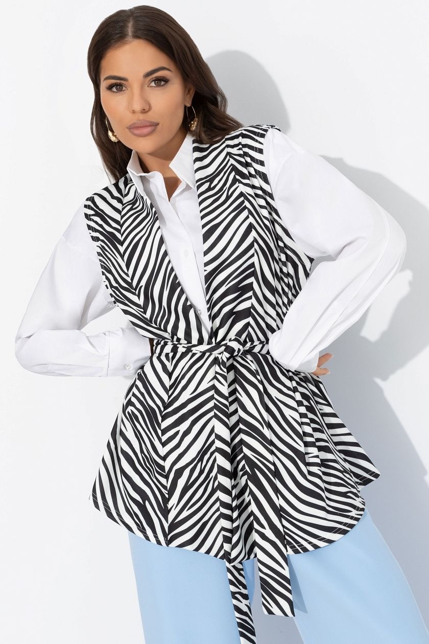 Жилет чёрно-белый с поясом от компании Charutti. Модель прямого силуэта, удлинённая. Выполнена из трикотажного полотна "милано". V-образный вырез горловины. Без рукавов. Изделие без подклада. Идеальный выбор для Вашего летнего гардероба.