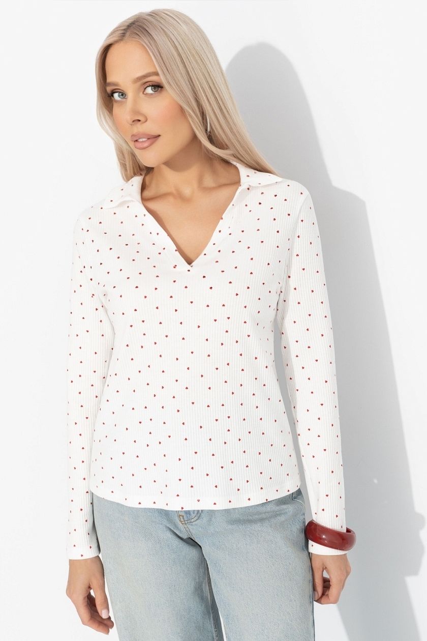 Поло белое с длинным рукавом от компании Charutti. Модель прямого кроя, выполнена из трикотажного полотна "Интерлок Карде" с принтом "сердечки". Отложной воротник переходи в V-образный разрез. Идеальный выбор для Вашего повседневного гардероба.