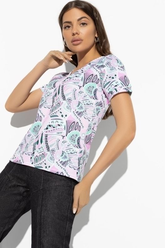 Футболка трикотажная с принтом и отделкой из кружева от компании Charutti. Модель полуприлегающего силуэта, выполнена из ткани "милано". V-образный вырез горловины. Втачные короткие рукава на манжетах. Идеальный выбор для создания стильного образа.