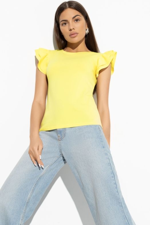 Футболка жёлтая с рукавами-крылышками от компании Charutti. Модель полуприлегающего силуэта, выполнена из трикотажной ткани "кулирка". Круглый вырез горловины. Втачные короткие рукава. Идеальный выбор на каждый день.