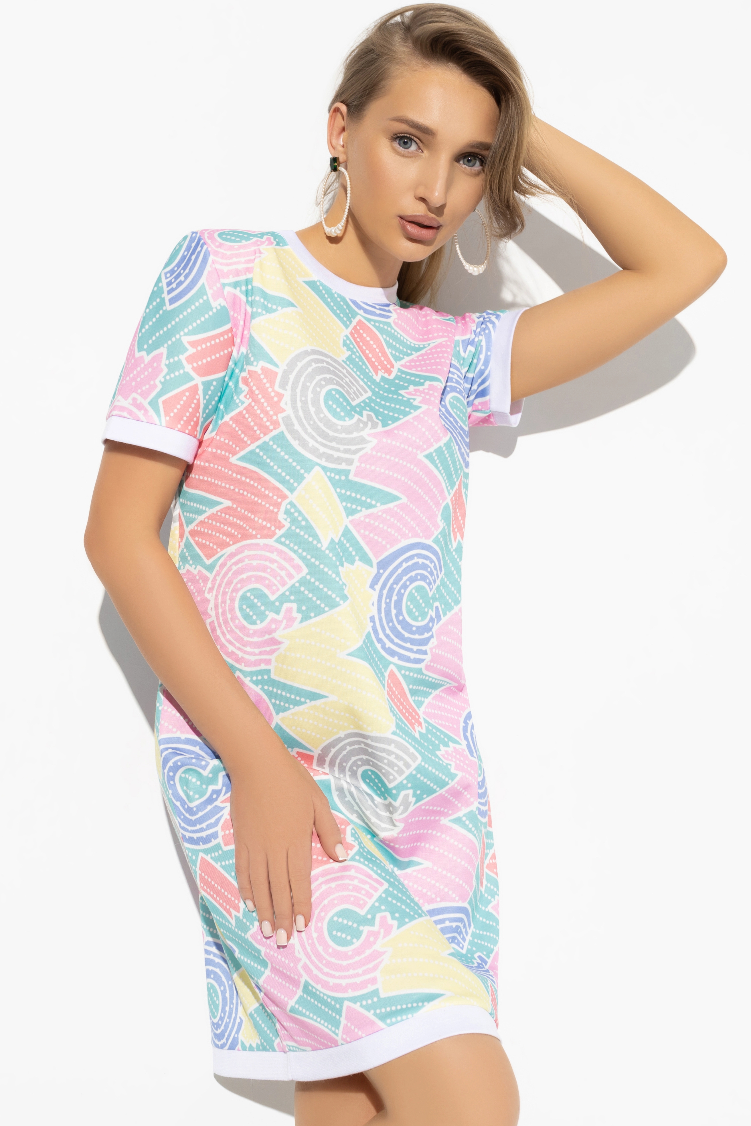 Короткое платье с принтом от компании Charutti. Модель свободного силуэта, выполнена из трикотажного полотна "милано". Круглый вырез горловины. Втачные короткие рукава на манжетах. Идеальный выбор для создания яркого образа.