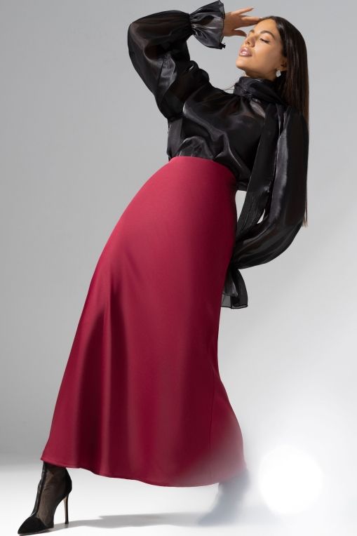 Юбка-макси шёлковая бордового цвета от компании Charutti. Модель прямого силуэта, выполнена из ткани "бавария". Талия изделия на тонкой вшитой резинке. Подклада нет. Идеальный выбор для модного образа на торжество.